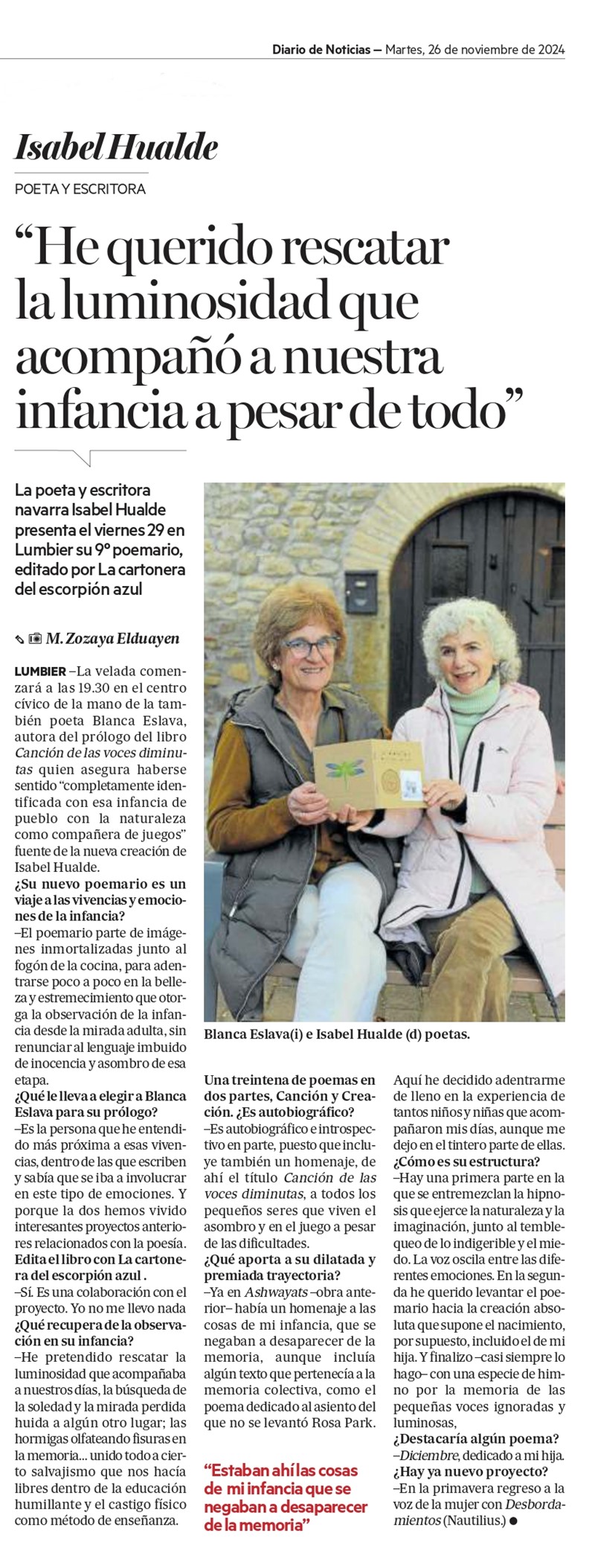 La velada comenzará a las 19.30 en el centro cívico de la mano de la también poeta Blanca Eslava, autora del prólogo del libro Canción de las voces diminutas quien asegura haberse sentido “completamente identificada con esa infancia de pueblo con la naturaleza como compañera de juegos” fuente de la nueva creación de Isabel Hualde.