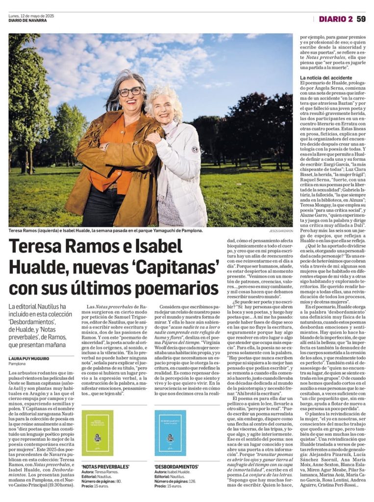 Los arbustos rodantes que impulsa el viento en las películas del Oeste se llaman capitanas (salsola kali) y son plantas muy habituales en Aragón y a las que el cierzo empuja por campos y caminos, esparciendo semillas y polen. Y Capitanas es el nombre de la editorial zaragozana Nautilus para la colección de poesía en la que reúne anualmente a al menos “diez poetas que han constituido un lenguaje poético propio y que representan lo mejor de la poesía contemporánea escrita por mujeres”. Este 2025 dos poetas procedentes de Navarra publican en esta colección: Teresa Ramos, con Notas preverbales, e Isabel Hualde, con Desbordamientos. Los presentan juntas mañana en Pamplona, en el Nuevo Casino Principal (19.30 horas).